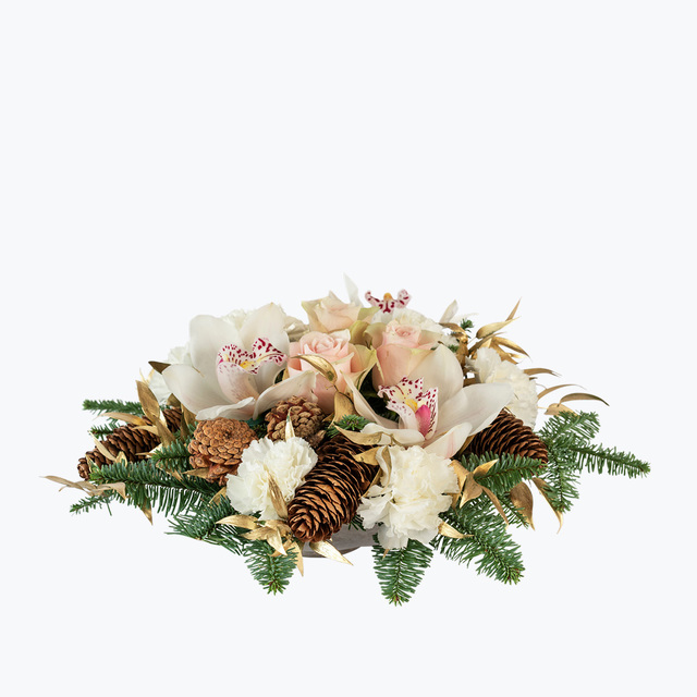 Vakker og frodig blomsterdekorasjon som stråler jul, en lys drøm rett og slett! Et godt valg når du ønsker å gi en delikat julehilsen levert på døren. Si det med blomster!